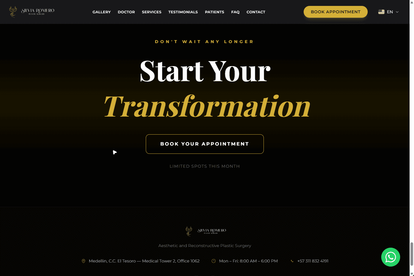 The platform was architected with patient trust as a primary KPI. Real Google-verified testimonials (5.0, 30+ reviews) are integrated and displayed natively. Dr. Romero's credentials — university, specialization, 5+ years, 1000+ surgeries, SCCP membership, Motiva certification — are structured as first-class content to reinforce authority. The 4-step patient journey (Assessment → Planning → Surgery → Follow-up) is visually mapped to reduce anxiety and increase conversion. The site supports international patients, multilingual considerations, and is optimized for local SEO in Medellín, Colombia.